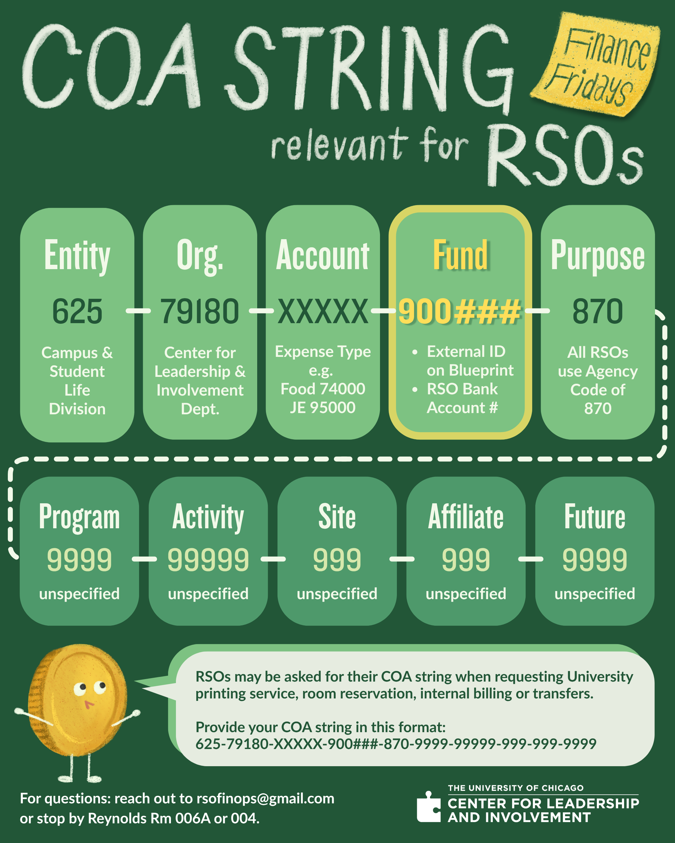 This FUND number is part of a larger account string which the University calls your "Chart of Accounts" or COA. As an RSO, you share a general COA with all other RSOs on campus, save for your Fund number.